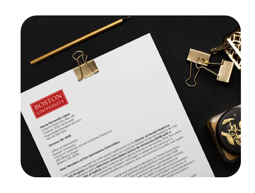 Dra. Meza , odontóloga internacional y graduada de UCLA DDS, para construir un documento que no solo cumpla con los requisitos técnicos, sino que conecte emocional y profesionalmente con los comités de admisión.